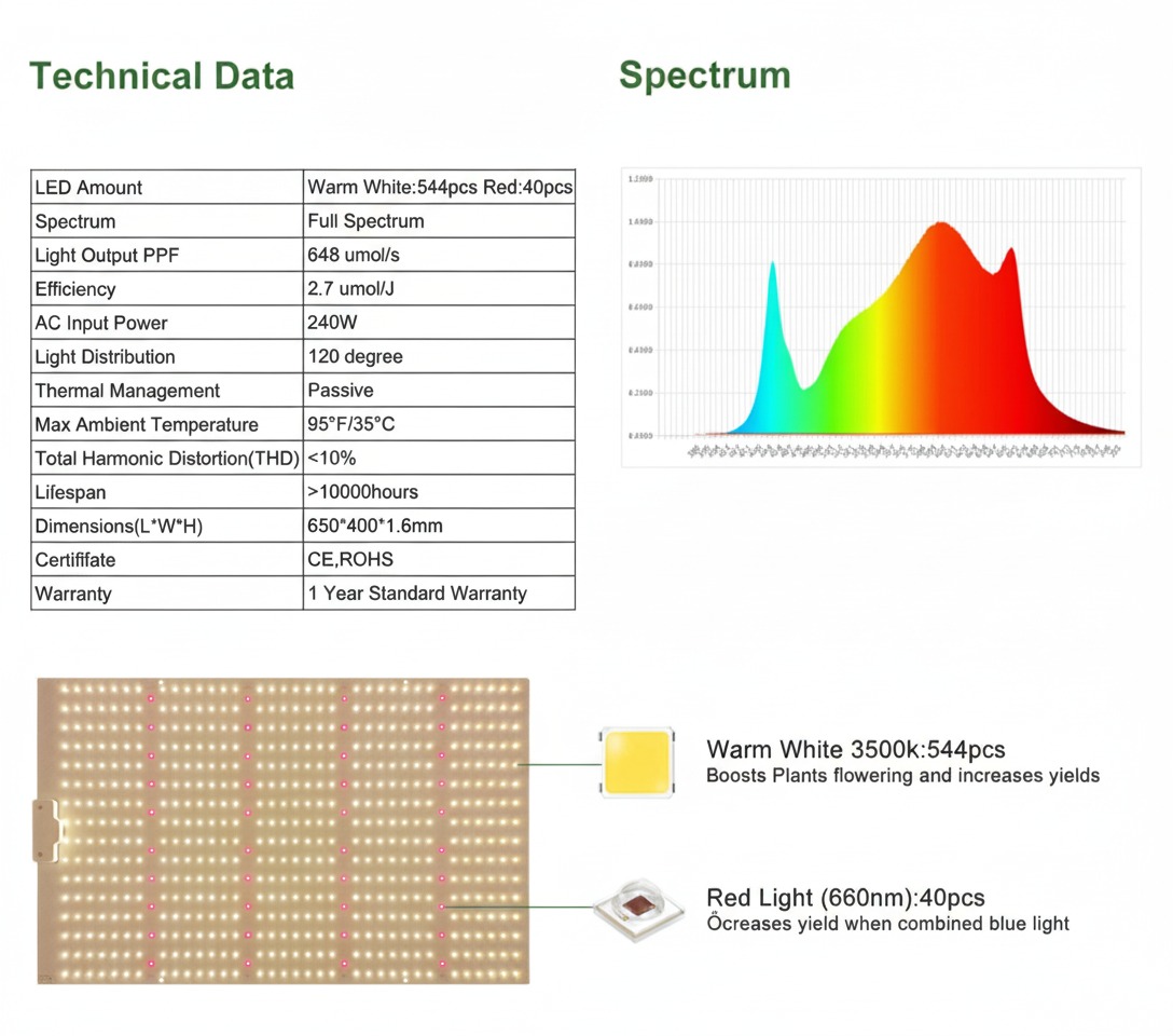 Ge dina växter den optimala ljusstyrkan med vår 240 W fullspektrum LED-lampa, designad för både växt- och blomningsfaser. Med sin stiliga övre toppplatta och möjlighet till seriekoppling gör den placering och installation både flexibel och elegant.